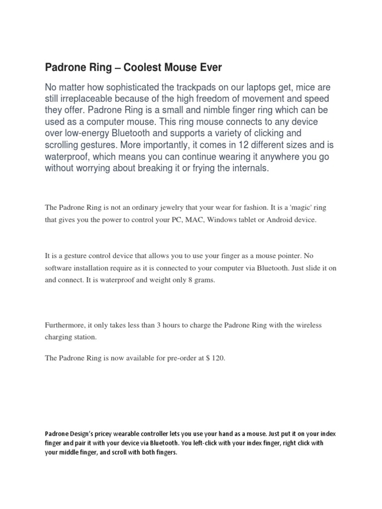 The ring lets you work exactly like you had an unlimited touchpad on your desk and it's worn on the index finger of either the left or right hand. The ring transforms the mouse into a fashion accessory thanks to the latest. It works just like the touchpad on your laptop, but you can use it on any table, on your lap or any surface. Just put it on your index finger and pair it with your device via bluetooth. Последние твиты от padrone.design (@padronedesign).